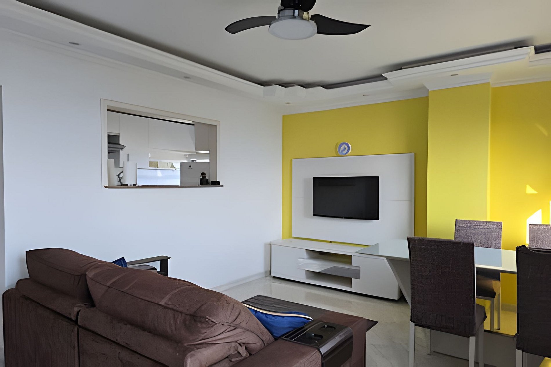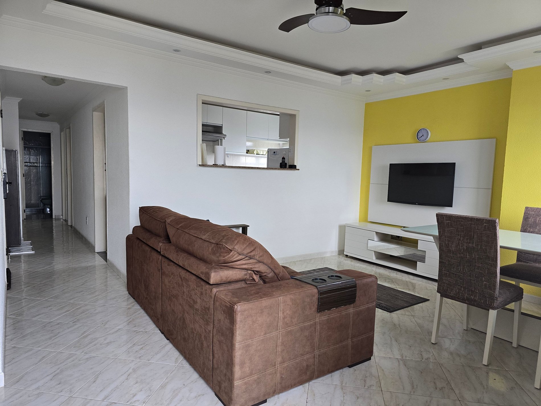 A sala é integrada à varanda e muito convidativa, perfeita para relaxar após um dia de praia. Cozinha bem equipada para preparar e servir refeições.