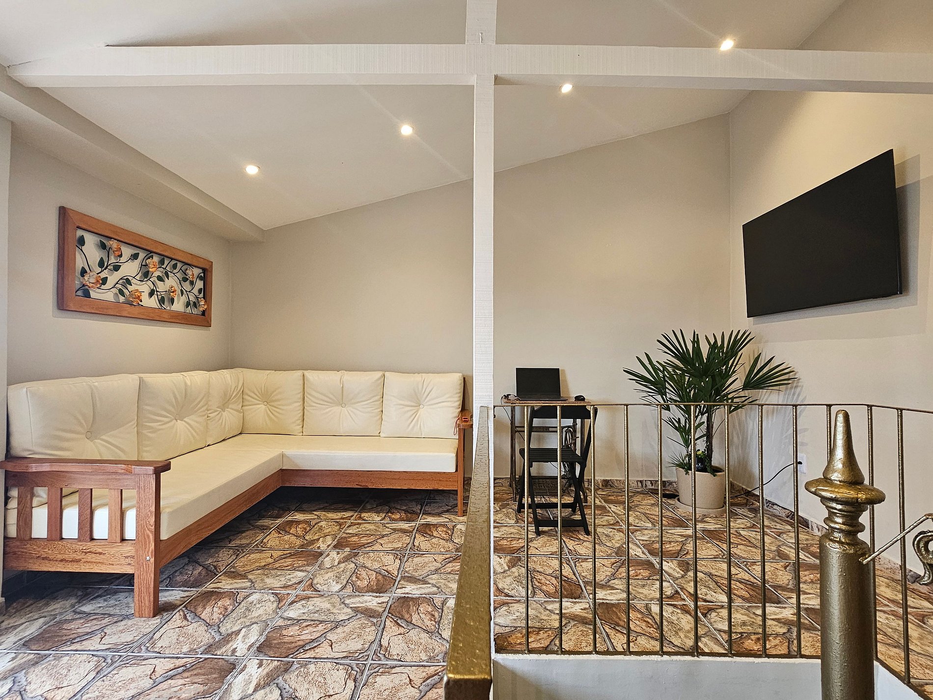 No segundo andar, há uma sala de convivência, com TV e um espaço dedicado ao trabalho remoto, além de mais um quarto, banheiro e uma área descoberta com vista panorâmica para o bairro e as montanhas. A cobertura também conta com exelente area gurmet.